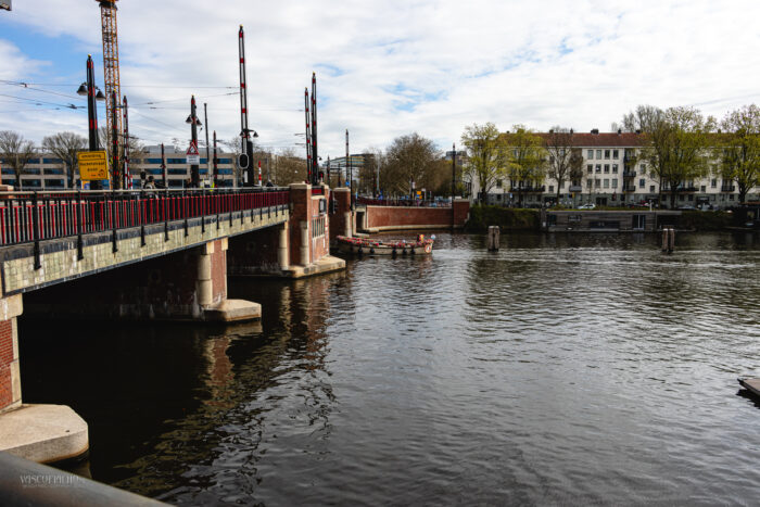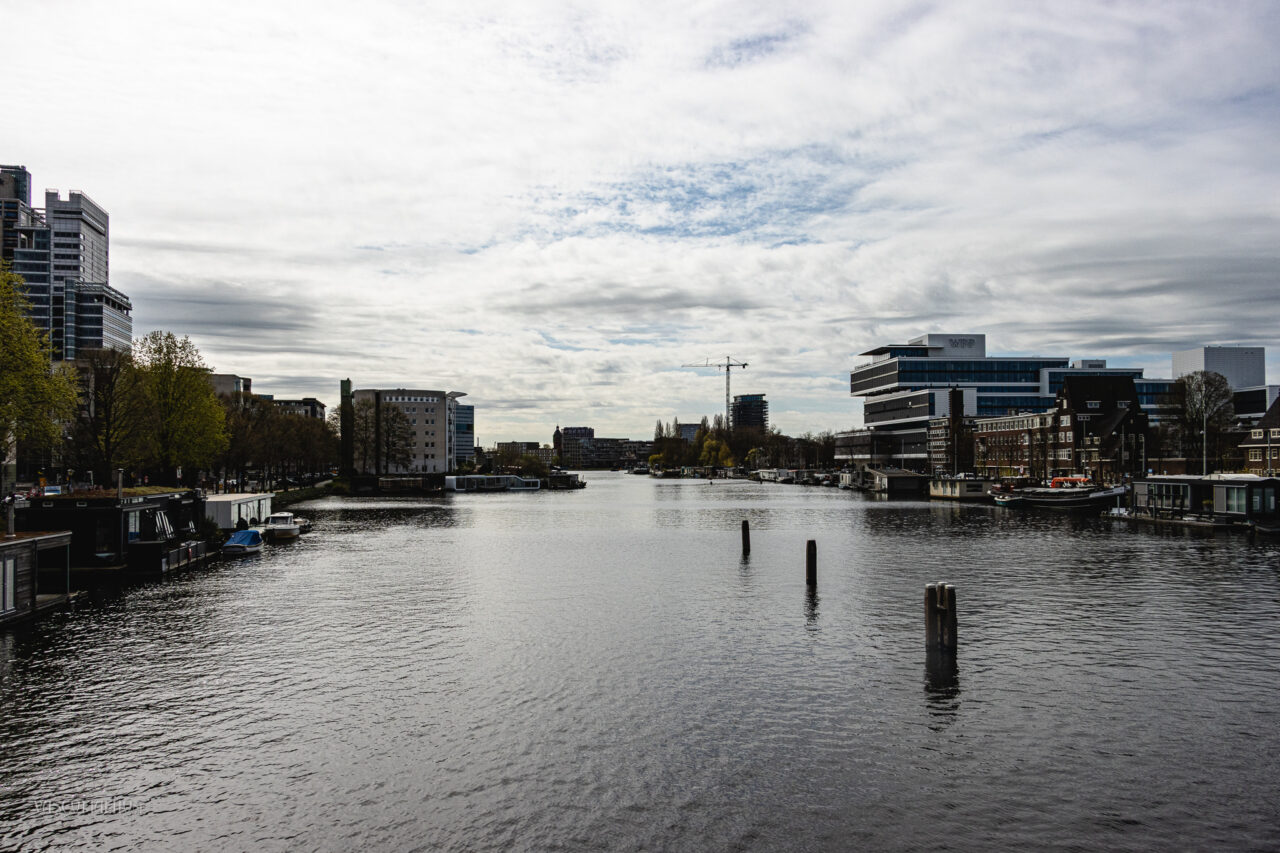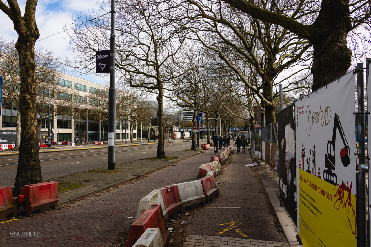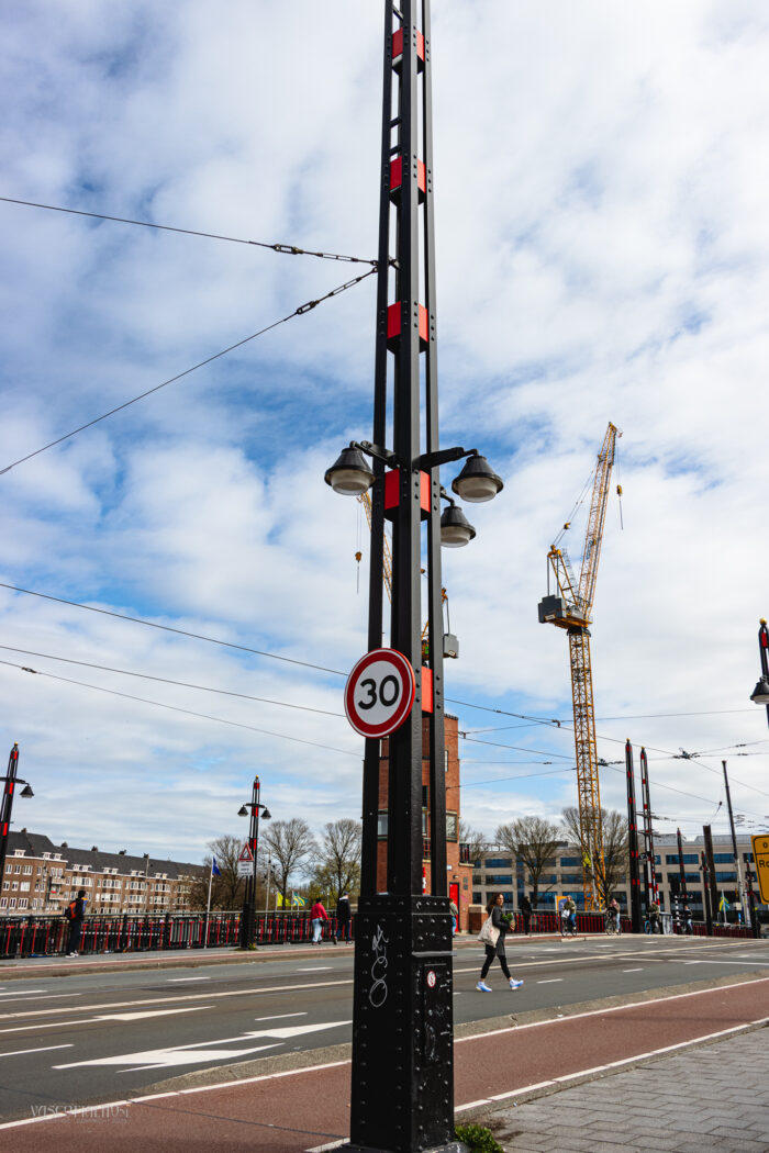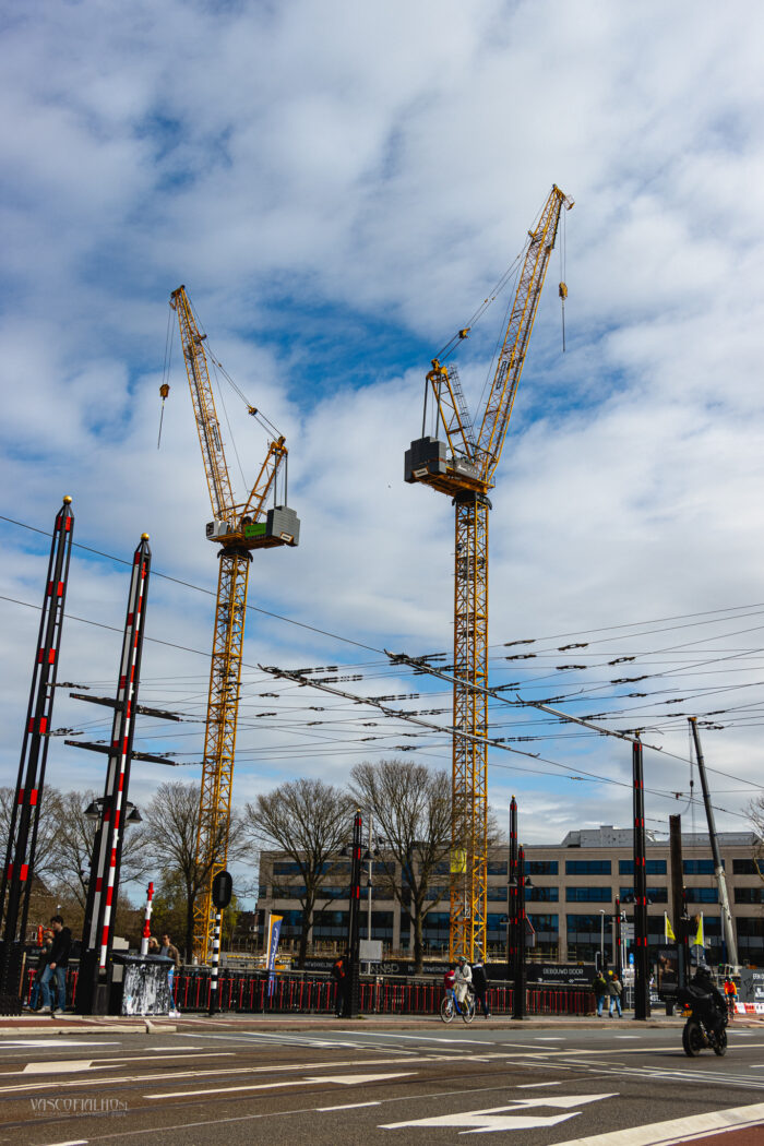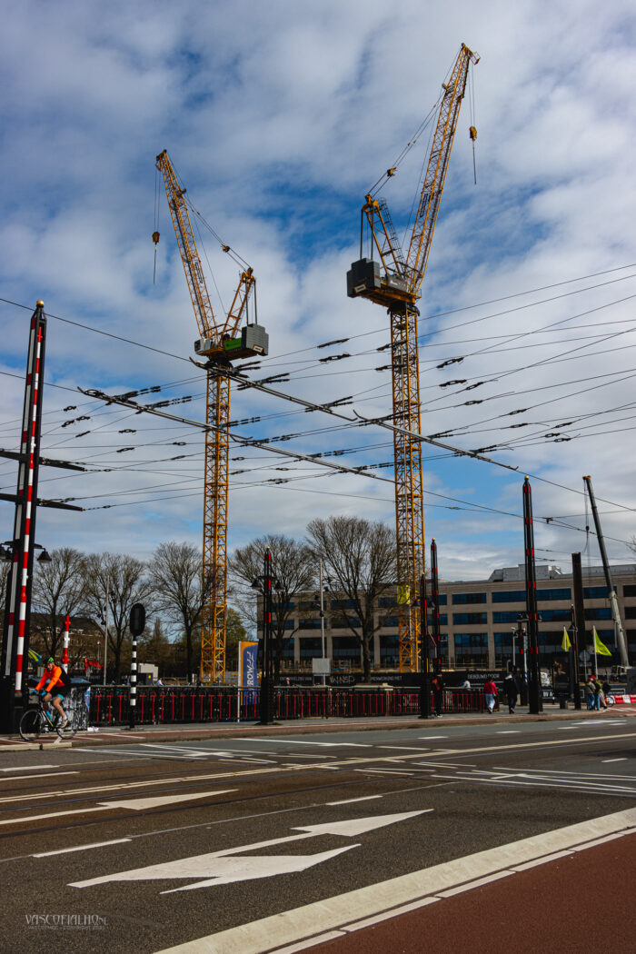 Net voorbij de Berlagebrug bij het Amstelstation torenen enorme bouwkranen boven de gebouwen uit. Ze wiegen als stille reuzen boven het bruisende verkeer, een opvallend contrast met de haastige stroom van fietsers en voetgangers beneden. Het voelt alsof de stad zelf ademt en beweegt, een voortdurend spel van lijnen, kleuren en vormen.