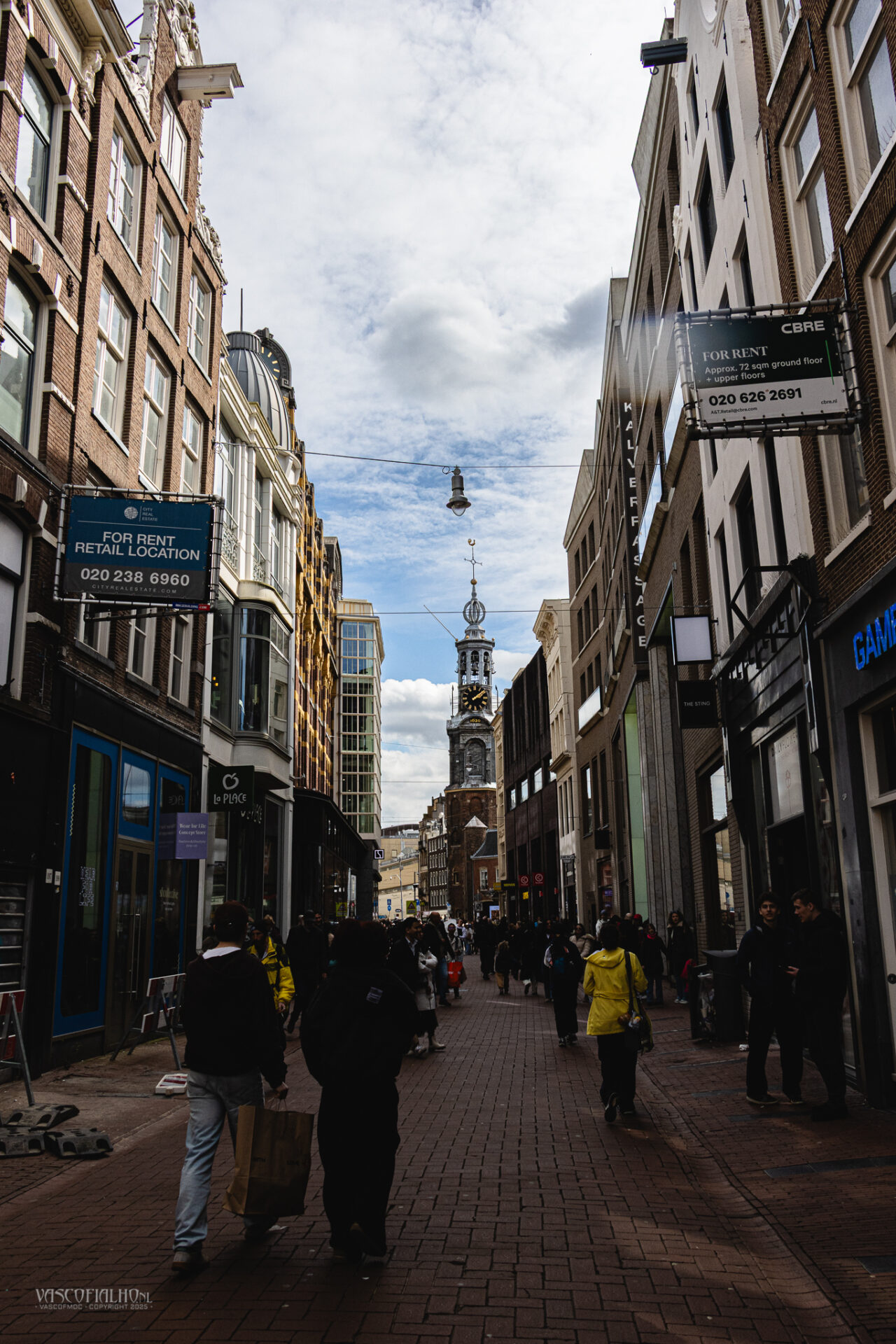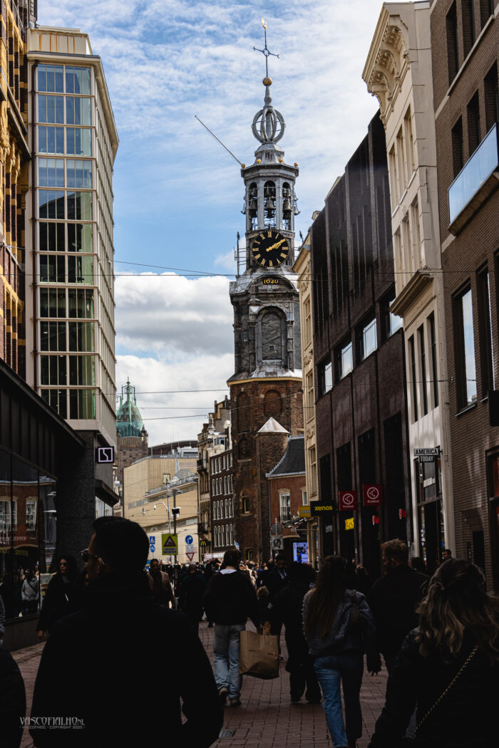 Later sta ik in de Kalverstraat, tussen de etalages en winkelend publiek, en vang ik een moment van rust op foto: de Munttoren, glanzend in het middaglicht, recht bij het Rembrandtplein. Vanaf daar nemen we de tram terug naar huis, terwijl de stad achter ons nog altijd pulseert, vol onverwachte momenten die wachten om vastgelegd te worden.